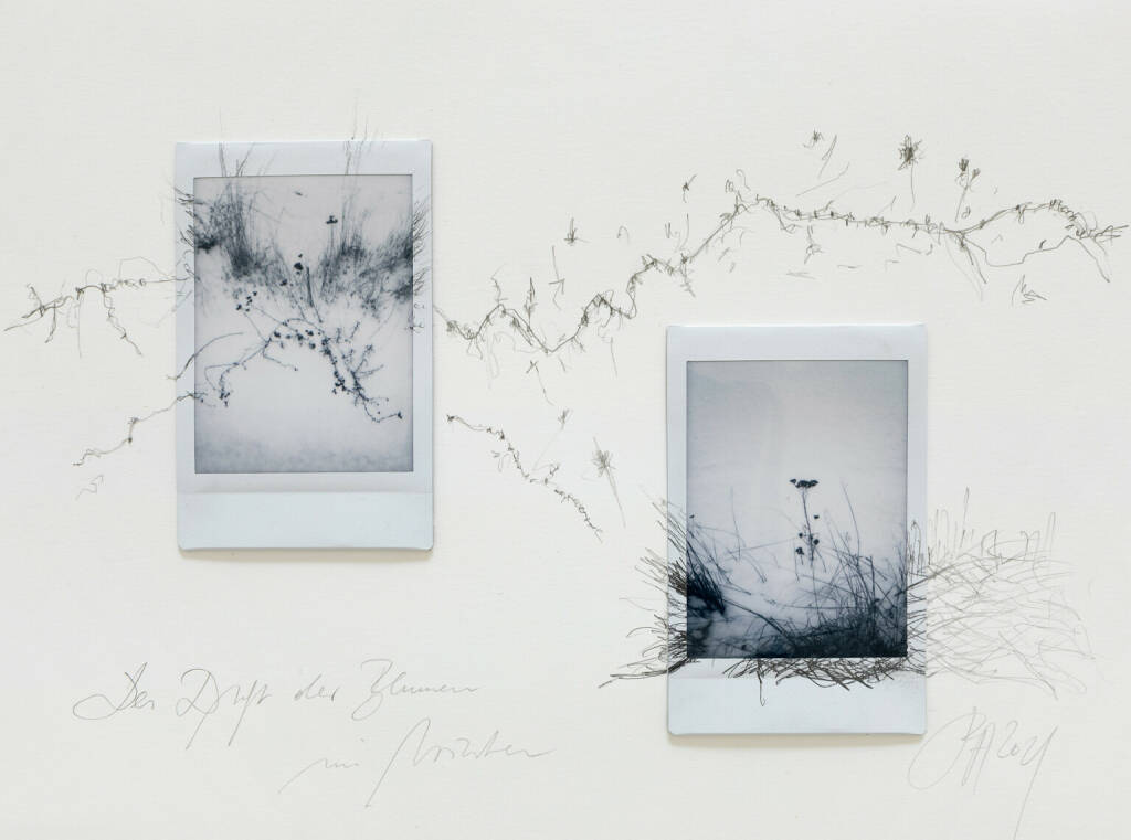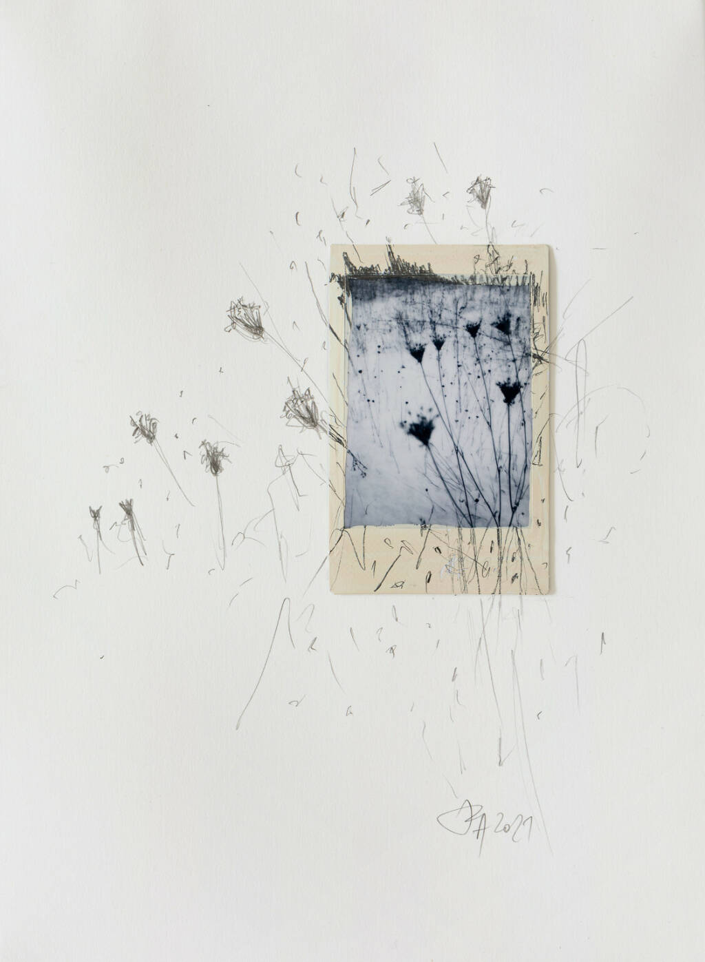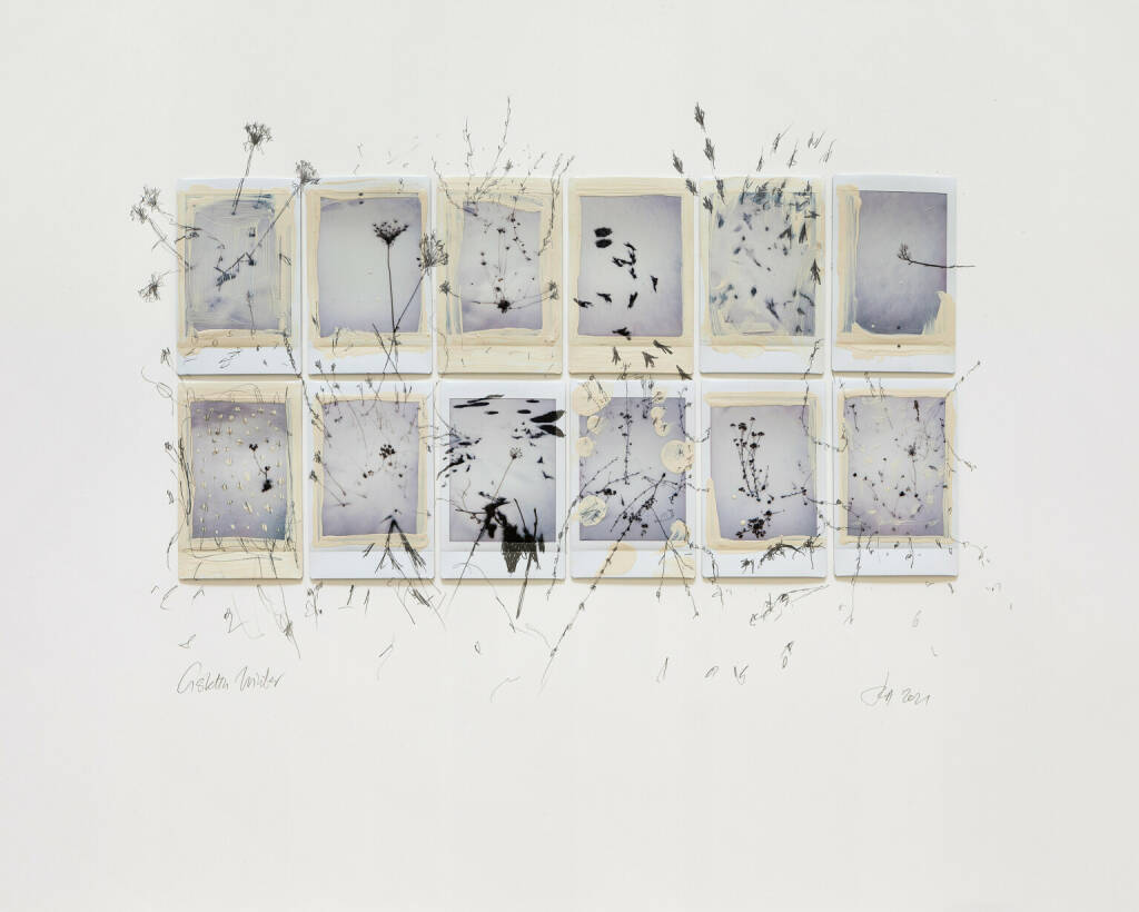 Regina Anzenberger Native Grounds 9, 2021, from the series Gstettn mixed media, instant photography, acrylic, pencil drawing, found objects, framed, 30 x 40 cm