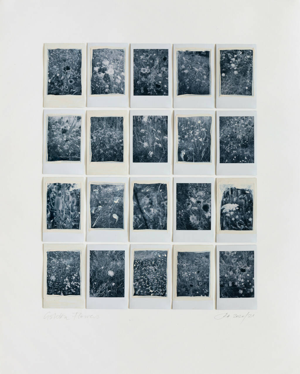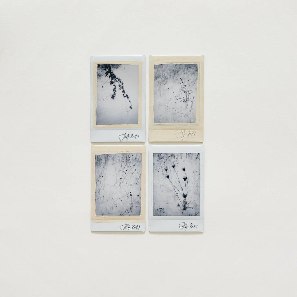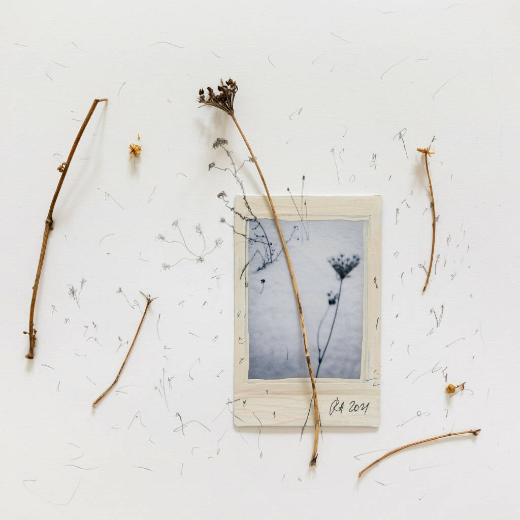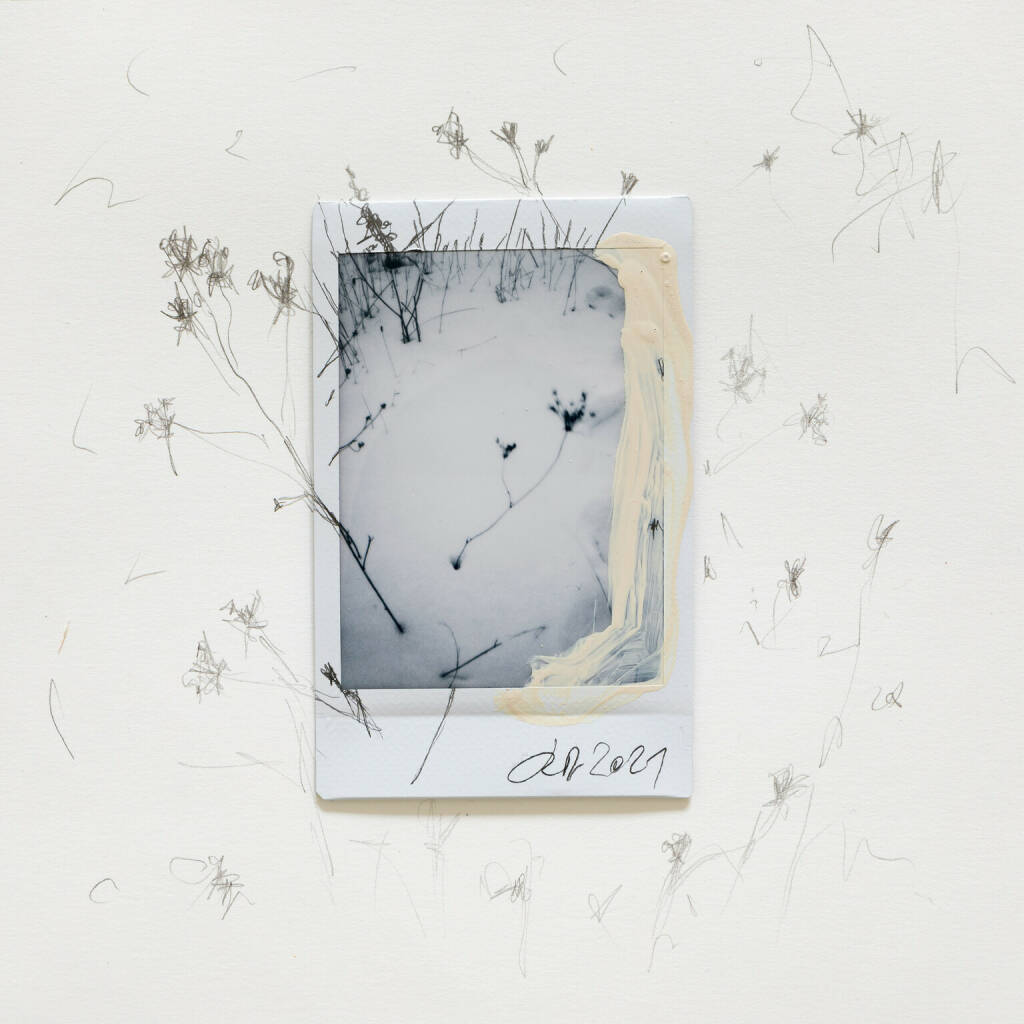 Regina Anzenberger Native Grounds 35, 2021, from the series Gstettn mixed media, instant photography, acrylic, pencil drawing, found objects, framed, 20 x 20 cm