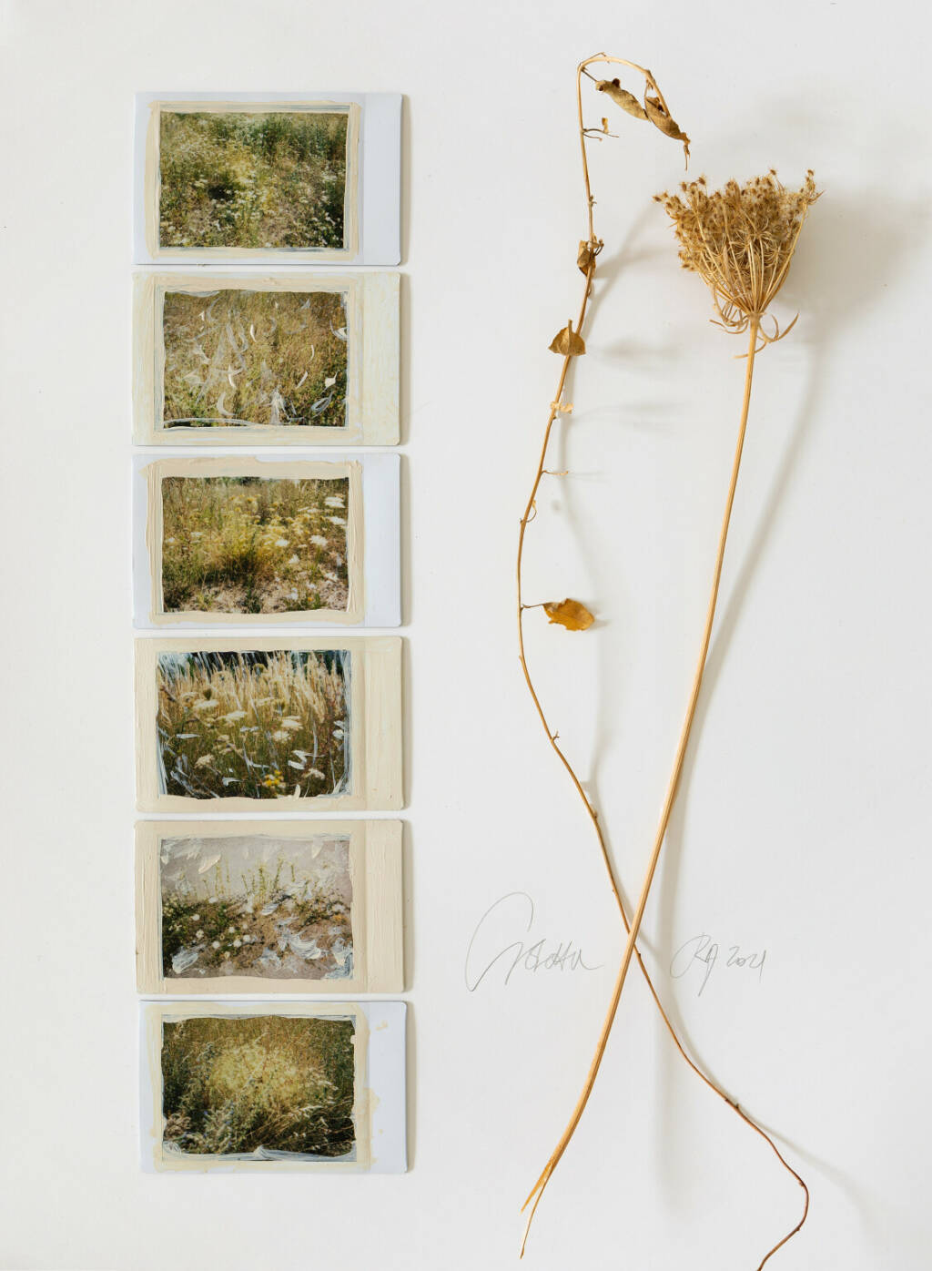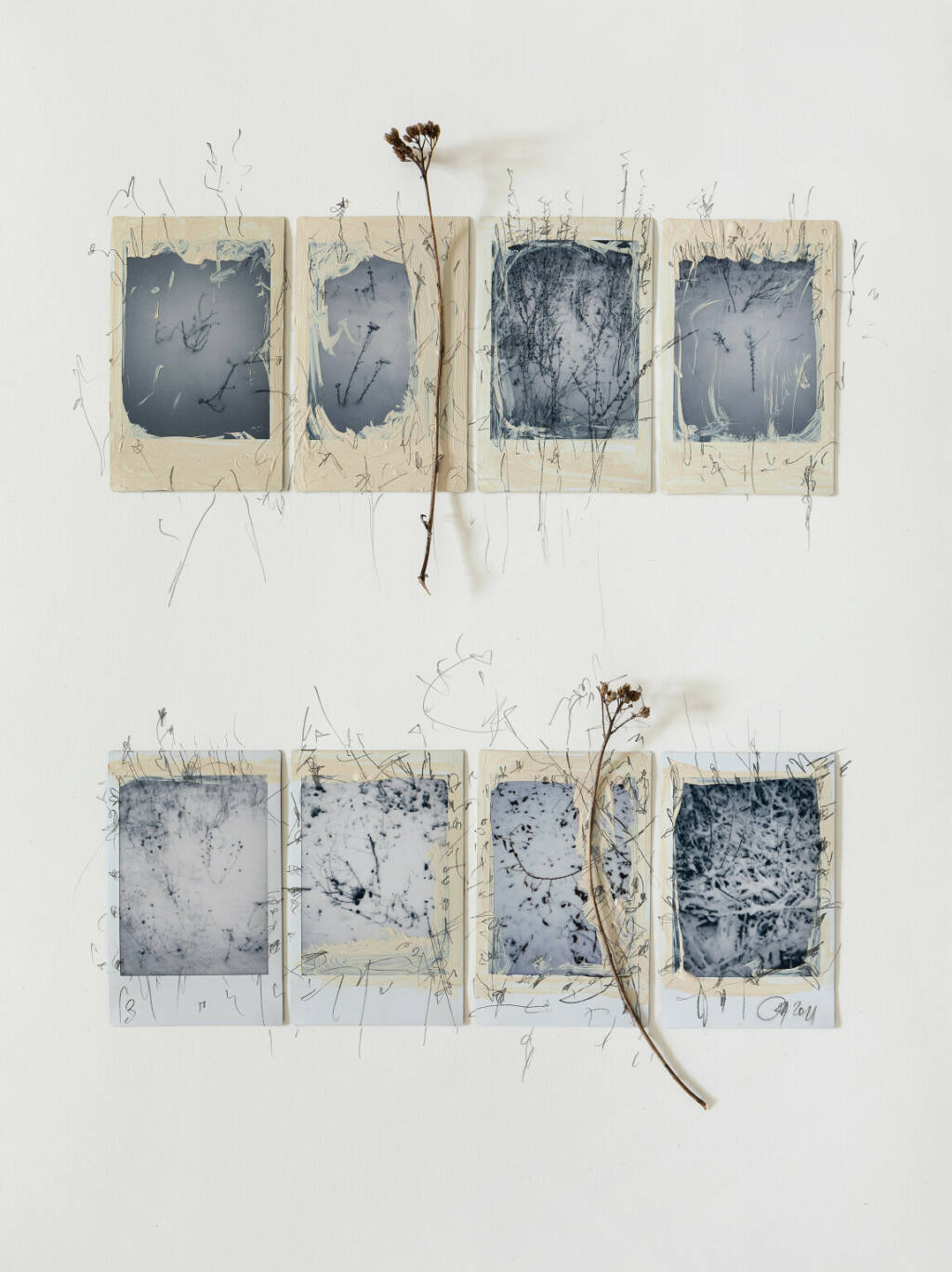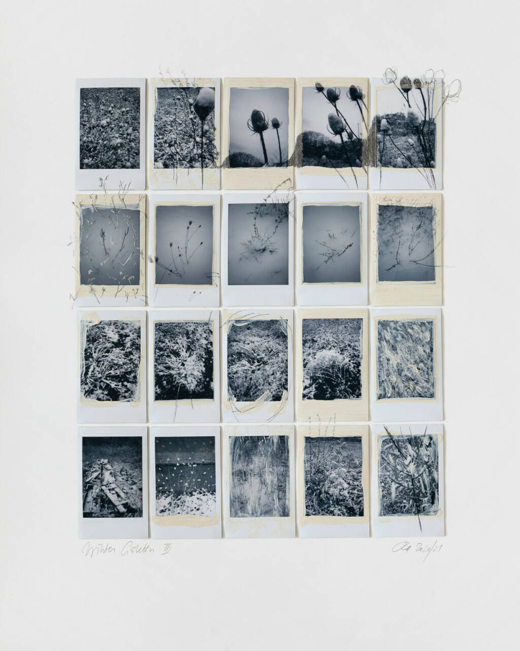 Regina Anzenberger Native Grounds 16, 2021, from the series Gstettn mixed media, instant photography, acrylic, pencil drawing, found objects, framed, 24 x 18 cm