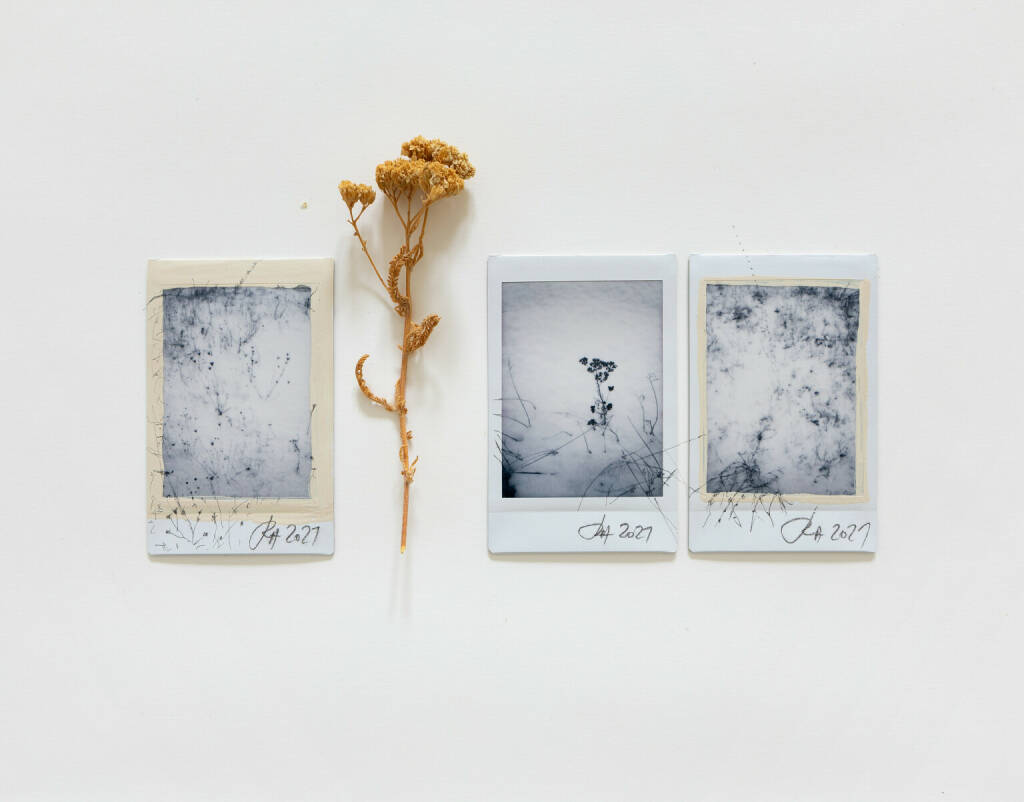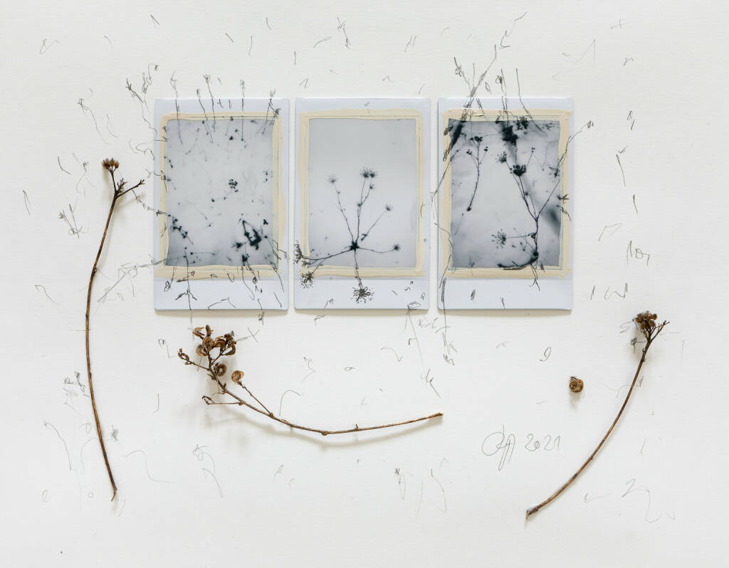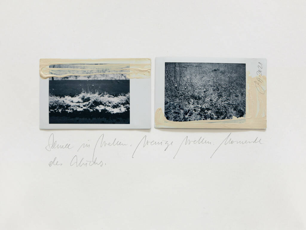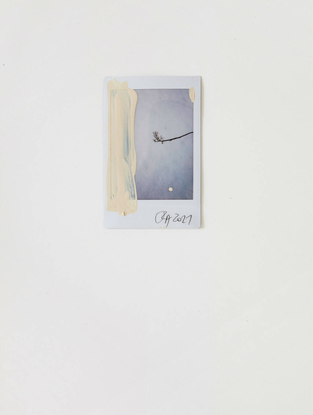 Regina Anzenberger Native Grounds 16, 2021, from the series Gstettn mixed media, instant photography, acrylic, pencil drawing, found objects, framed, 24 x 18 cm