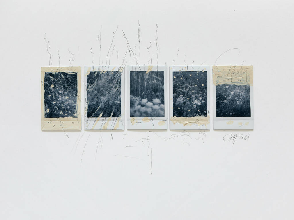 Regina Anzenberger Native Grounds 11, 2021, from the series Gstettn mixed media, instant photography, acrylic, pencil drawing, found objects, framed, 30 x 40 cm