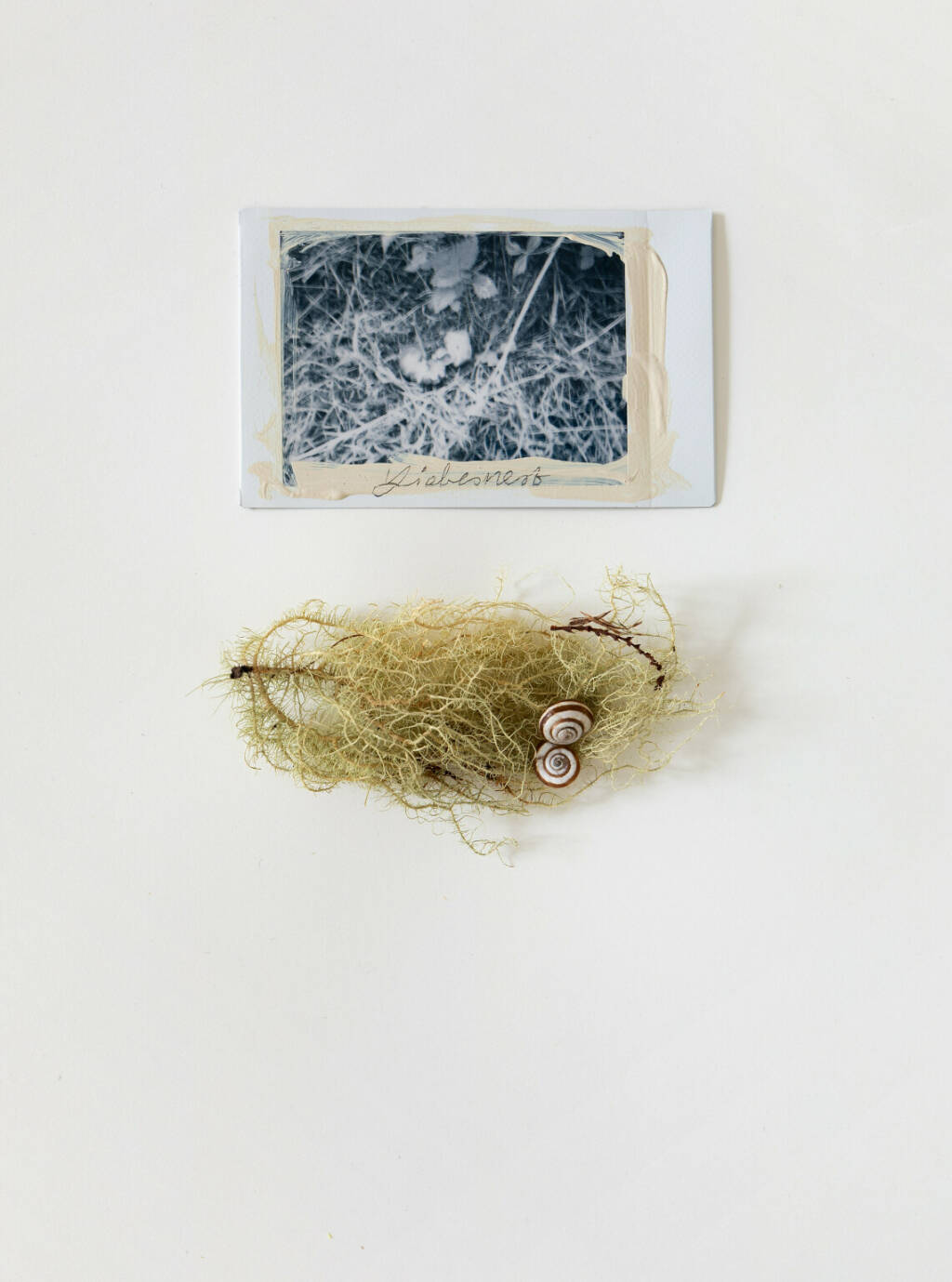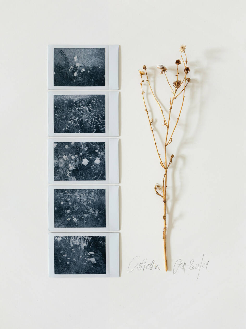 Regina Anzenberger Native Grounds 28, 2021, from the series Gstettn mixed media, instant photography, acrylic, pencil drawing, found objects, framed, 24 x 18 cm