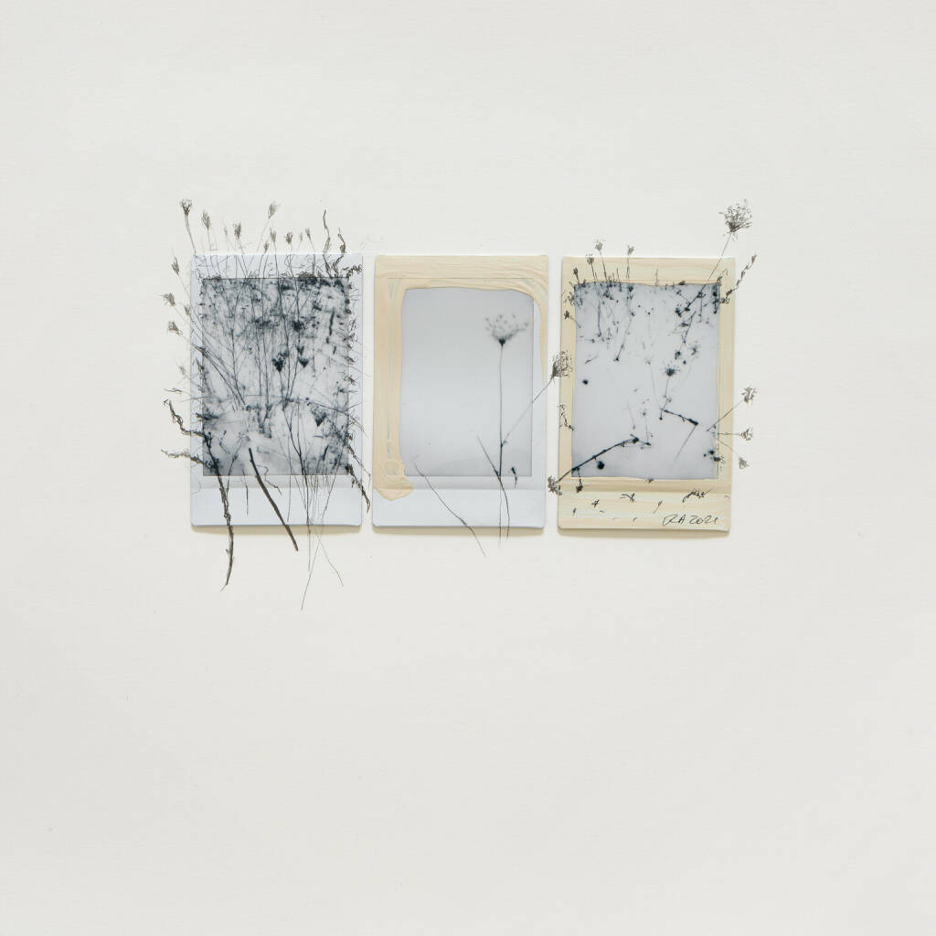 Regina Anzenberger Native Grounds 41, 2021, from the series Gstettn mixed media, instant photography, acrylic, pencil drawing, found objects, framed, 30 x 30 cm