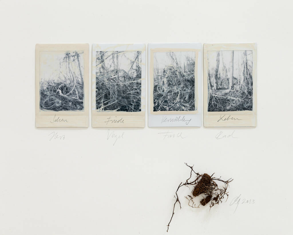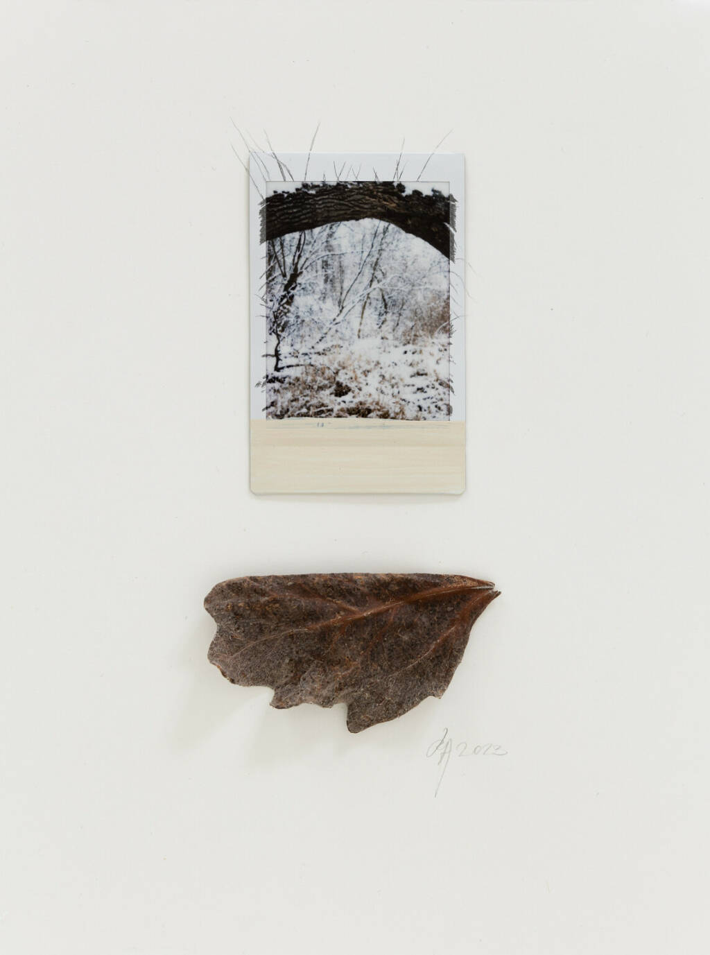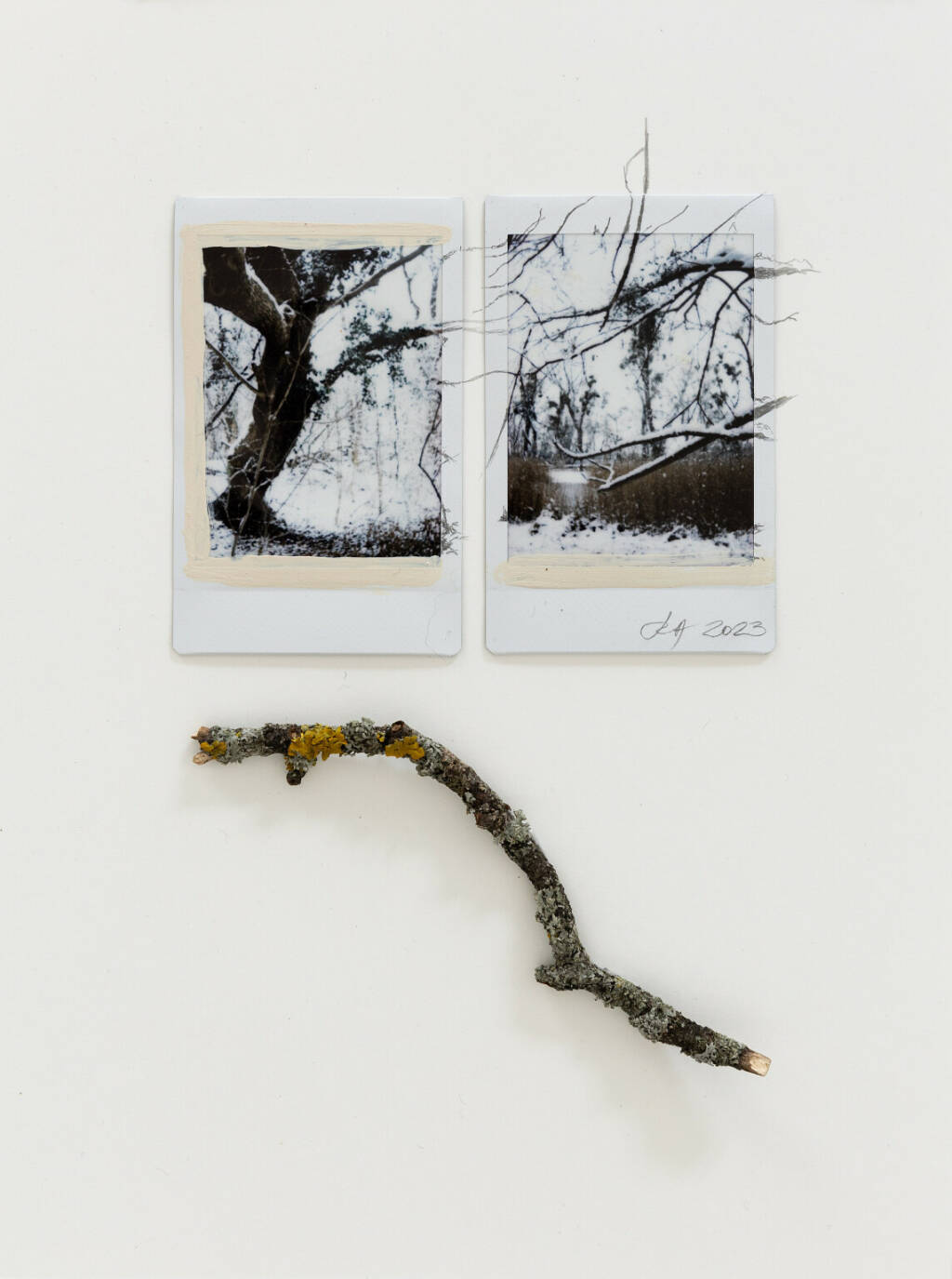 Regina Anzenberger Roots & Waltz (Native Grounds) II, 2023 mixed media, instant photograph, acrylic, pencil, found objects, 30 x 30 cm