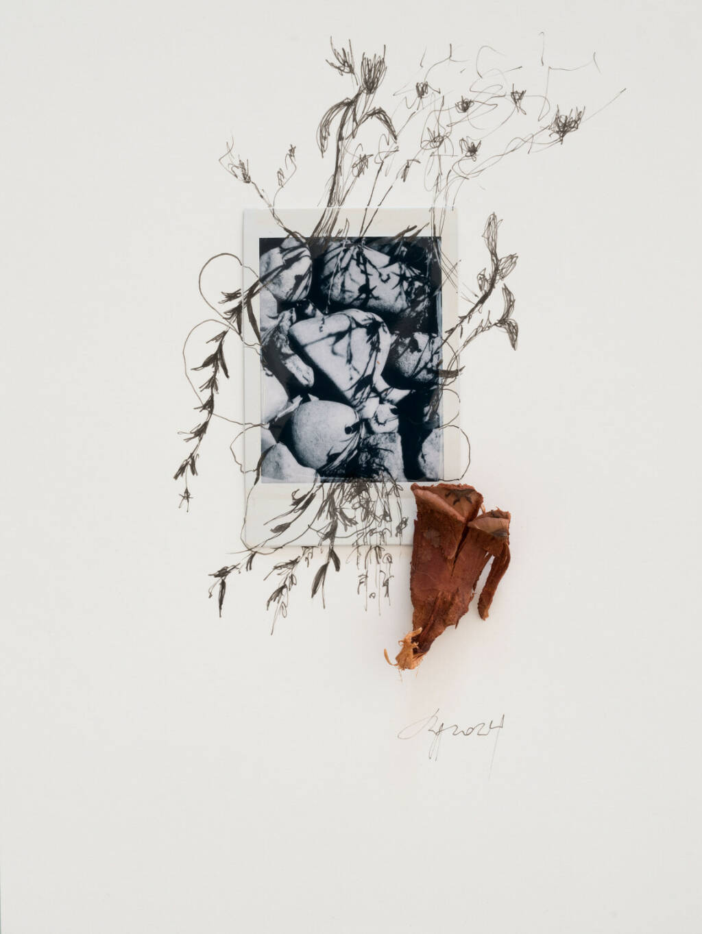 medium: mixed media, instant photograph, pencil, found objects