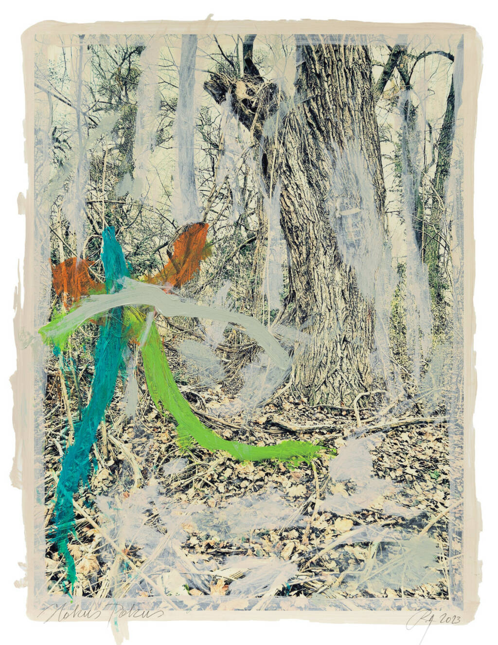 Regina Anzenberger Roots & Waltz XXI, 2023 mixed media, pigment print on Hahnemühle PhotoRag Ultra Smooth, acrylic painting, pencil, 53 x 40,5 cm